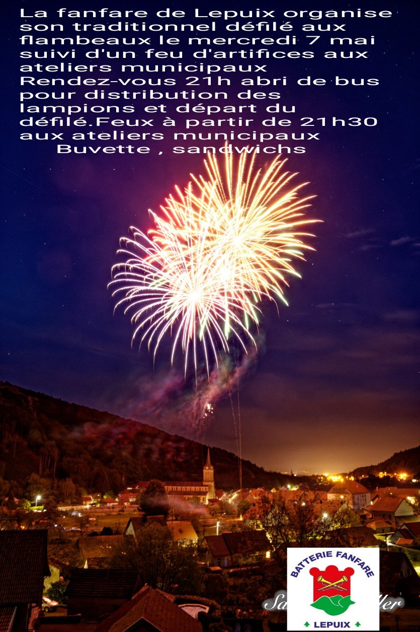 La Batterie Fanfare de Lepuix organise son traditionnel défilé aux flambeaux le jeudi 7 mai suivi d'un feu d'artifice derrière les ateliers municipaux